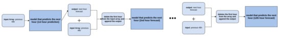 As described, the models presented in Section 3 were trained to predict the energy consumption of the next hour using data from the previous 48 h. By definition, this prediction is classified as very short-term load forecasting (VSTLF) []. For comparison and analysis purposes, we used the same models’ configuration to predict the next 12 and 24 h, in order to explore short-term load forecasting (STLF) performance []. This was achieved as follows: once which is the best model to predict the next 1 h (the single-output regression model) is defined, this model will be used to create a chained multi-output regression, that is, a linear sequence of models capable of performing multi-output regression. This means that the first model in the sequence takes an input and predicts the output, then the second model uses the same input as the first model by adding the output of the first model to make a prediction, etc. (A schematic can be seen at Figure 11). This approach is used to define the VSTLF model, to predict the next 12 and 24 h. This technique can end up propagating residual errors throughout the prediction, but despite this, it allows to use of the same trained model to carry out larger predictions, in a simple way and without needing to train new models. Both VSTLF and STLF can be used for the purchase and production of electric power, but STLF has more broad applications, such as the transmission, transfer, and distribution of electric power, the management and maintenance of electric power sources, and the management of daily electric load demand []. Furthermore, it can be used by ESCOs to inform energy performance contract design and implementation.
