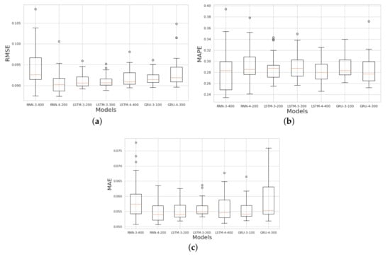 Boxplot of (a) RMSE, (b) MAPE, and (c) MAE regarding the best deep learning models.