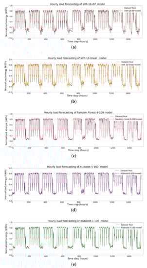 Hourly load forecasting using (a) the SVR-10-rbf model; (b) the SVR-10-linear model; (c) the Random Forest-9-200 model; (d) the XGBoost-5-100 model; and (e) the XGBoost-7-100 model.