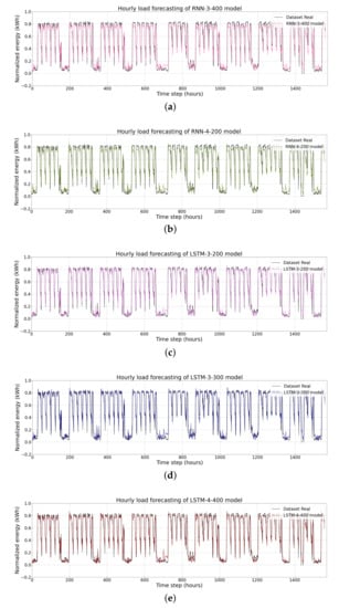 Table 5 presents the RMSE, MAPE, and MAE results of the five machine learning models (SVR-10-rbf, SVR-10-linear, Random Forest-9-200, XGBoost-5-100, and XGBoost-7-100) and the seven deep learning models (RNN-3-400, RNN-4-200, LSTM-3-200, LSTM-3-300, LSTM-4-400, GRU-3-100, and GRU-4-300) defined in the previous section. Figure 12 presents the maximum and minimum values for the best deep learning model.