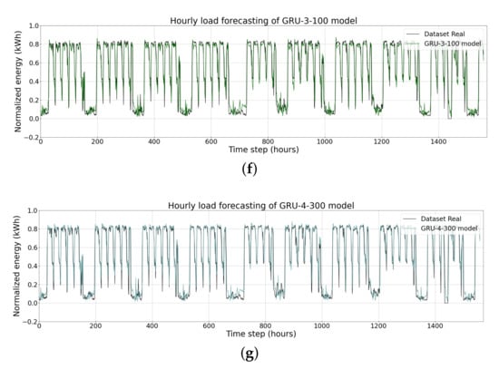 Hourly load forecasting using (a) the RNN-3-400 model; (b) the RNN-4-200 model; (c) the LSTM-3-200 model; (d) the LSTM-3-300 model; (e) the LSTM-4-400 model; (f) the GRU-3-100 model; and (g) the GRU-4-300 model.