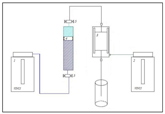 Schematic diagram of the filtration unit. (1—HP pump 100-10, 2—pump (to create a cut), 3—core holder, 4—piston storage device, 5—valve).