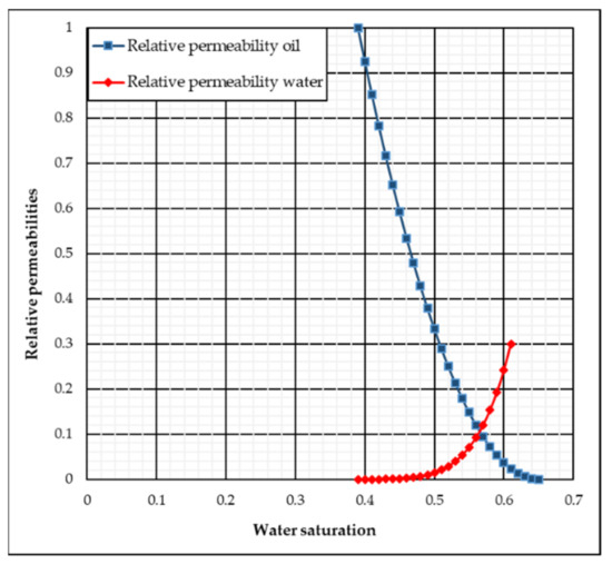 For building the Buckley–Leverette model, the results of laboratory studies on relative permeability (rel-perm) on the core of the pilot section were required as input data. The phase permeability was determined using RPS-81we system by Coretest Systems, followed by plotting rel-perm curves. A sampling of the whole core of the Pokur suite was very complex because core samples are represented by non-consolidated sandstone. For all experiments, sand pack tube models with absolute permeability to air 7, 70, 500, 1500 mD were used, which corresponded to the range of permeability variation of the Pokur suite. The lengths of the obtained samples were 8 cm and their diameters were 3 cm. The core and fluids for this and subsequent experiments were prepared for study and their reservoir properties were determined: open porosity and permeability were determined in full accordance with industry standards [37,38]. The studies were carried out at the facility with the schematic diagram shown in Figure 3. The pump system accuracy was high and makes 0.1% of full scale. Relative rel-perm results for the model with the permeability of 500 mD can be found in Figure 4.