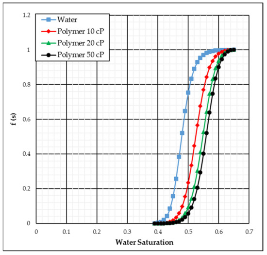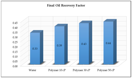 The calculation was based on the equation of permeability and the Buckley–Leverette model of two-phase filtration for PK bed conditions. Two-phase flow in the formation (oil–water or oil–polymer solution) was considered for the calculation of the main parameters of the displacement efficiency. The model was calculated using various fluids, namely: water with a polymer viscosity of 10 mPa∗s, 30 mPa∗s, and 50 mPa∗s. In the calculation of ORF, recovery time is carried out until the maximum profitable value of 98% watering is achieved.