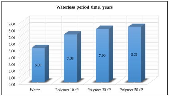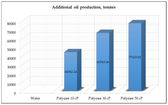 From the table, it can be seen that the most economically advantageous is the injection of polymer solution with a viscosity of 50 cP, which is primarily because the main costs for the implementation of polymer water flooding technology relate to the initial capital investment in the injection well for continuous injection. Therefore, we continued our calculations with these values of viscosity and concentration.