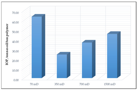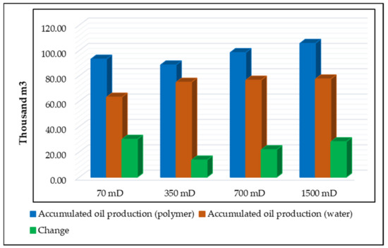 For hydrodynamic modeling of oil displacement from the Pokur suite model, it was decided to use horizontal wells, as in the actual conditions of oil fields working with such formations, because of their low thickness. Two production wells and one horizontal well were in operation until the arrival of water. The polymer was injected as at the start of field exploitation. An important assumption in the model was that only injection wells are a source of water. As the permeability of the Pokur suite varies in a very wide range, studies were carried out on models of different permeability. Figure 12 shows the evolution of the accumulated production resulting from the application of the technology. It can be seen from the figure that the polymer was not applicable for low permeability (up to 10 mD), which could be due to the increased value of adsorption, formation clogging, or a sharp decrease of reservoir properties. A possible solution for displacement oil from low permeability PK formation may be the use of a low-molecular-mass polymer with lower adsorption values and better filtration properties [41,42]. Further calculations did not consider the results obtained from the displacement of oil from the 7-mD-permeable reservoirs because of the total loss of intake formation capacity in the calculation. However, for permeability, where no significant reduction filtration performance was achieved, the efficiency was compared with the basic option (water displacement). A comparison of accumulated oil production for models with different permeabilities is presented in Figure 13.