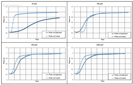 As can be seen from the figure, the introduction of polymer water flooding in all cases represents a significant increase in the final value of accumulated oil production. The maximum increase was observed in the reservoir model with an average permeability of 70 mD, which may be primarily due to the maximum residual resistance.