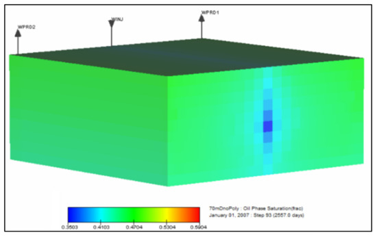 By comparing the distribution of oil saturation, it can be concluded that the introduction of polymer water flooding technology allowed covering the deposits more fully with the process of displacement. The values for residual oil saturation were close to those for scaled connate water saturation.