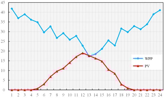 In this VPP of Western China, the power supply side includes 25 MW × 3 wind turbine, 14 MW × 3 PV power station, 40 MW CHP unit, and 20 MW energy storage device and the parameters of the generators are shown in Table 1. The output parameters of the unit are shown in Table 1. Based on the historical generation output on certain typical days, 10 sets of forecasted power output of WPP and PV are simulated and take the average value of each time point as the final forecasted power [19]. The day-ahead market declaration curve of power purchasing enterprises and the average available power are shown in Figure 4.
