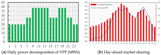 In Table 2, the feed-in tariff of WPP is 296 yuan (47.03 USD)/MWh. The feed-in tariff of PV is 487 yuan (76.34 USD)/MWh. The penalty cost of curtailed wind power is 176 yuan (27.59 USD)/MWh, and the penalty cost of curtailed PV power is 243 yuan (38.09 USD)/MWh. The up-regulated standby quotation and down-regulated standby quotation are 150/MWh and 120/MWh, respectively. The transaction price of thermal power bilateral agreement was 278.2 yuan (43.61 USD)/MWh. If the selling price of the green certificate of VPP is set at 164 yuan (25.71 USD)/piece, the transaction price of the annual bilateral contract is 442.2 yuan (69.32 USD)/MWh and the transaction power is 248.83 GWh. After annual and monthly power decomposition, the daily power is 691.2 MWh. Applying the peak-normal-valley decomposition rule, the daily contract power supply curve is as shown in Figure 5a (peak period: 9:00–15:00, 18:00–21:00; valley period: 23:00–7:00 the next day; normal period: 7:00–9:00, 15:00–18:00, 21:00–23:00). The deviation assessment coefficient is 3%, and the penalty coefficient of the excess part is calculated as 1.2 times of the benchmark price of thermal units.