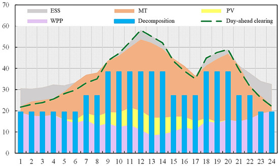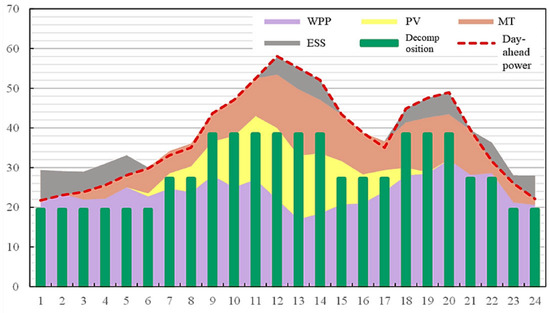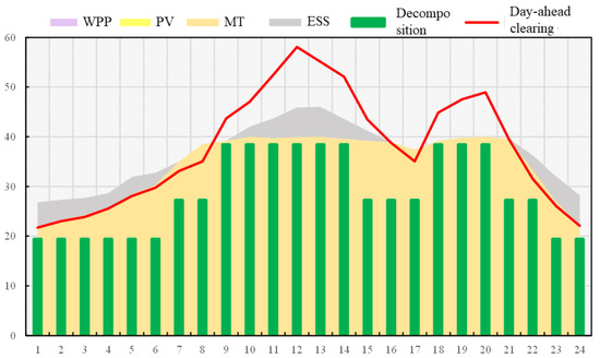 During the operation of VPP, there is an extreme scenario of no output of renewable energy, and all the power decomposition of medium- and long-term contracts completely needs to be met by other units. By adjusting the operation of MT unit and ESS, the contract curve can be basically met. However, if participating in the day-ahead market, the output capacity of VPP will be limited to a certain extent. The operation state of VPP without renewable energy output is shown in Figure 10.