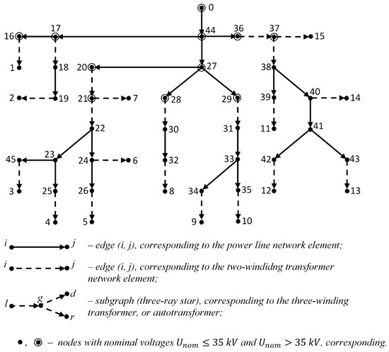 - Communication transformers divide the initial network graph into two subgraphs: a subgraph with a lower step of the rated voltage kV, whose nodes are shown as a point “⋅”; subgraph with the upper step of the rated voltage kV, which nodes are shown as a point with a circle.