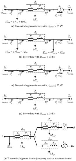3.3. Calculation of Power Flows and Losses of Electricity in Networks with Different Nominal Voltages