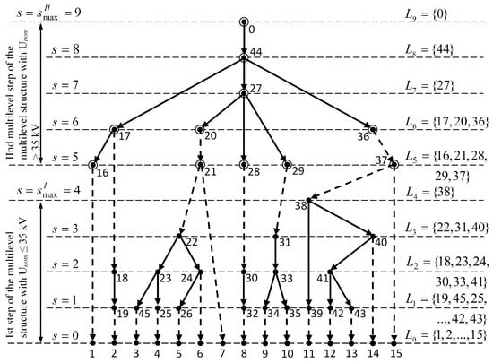 - Formulation of the calculation structure for the and the stop condition:where , denote, respectively, the lower and upper limits of changing the number of the hierarchy level s at the first stage (from bottom to top); , denote respectively, the lower and upper limits of the change in s at the second stage (from top to bottom); denotes the Boolean value to disable () and enable () of the computational module “from bottom to top” at the last cycle of the iteration k; denotes total power losses for different types of sections (see Figure 2 and Table 1).