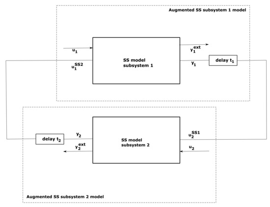 If we assume that delayed outputs of the state-space subsystem models are inputs of the other state-space subsystem model, this means that , , and their connection is visualized in Figure 5.