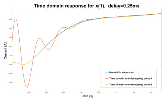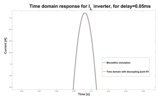 In contrast, choosing decoupling point R1 leads to a stable and accurate distributed system simulation even for the larger delays, and thus it is shown that the partitioning methodology developed in this paper suggests a better decoupling point. A comparison of time responses of the inductance current for decoupling point R1 and a monolithic system simulation for and in one of the sinusoidal peaks can be seen in Figure 10.