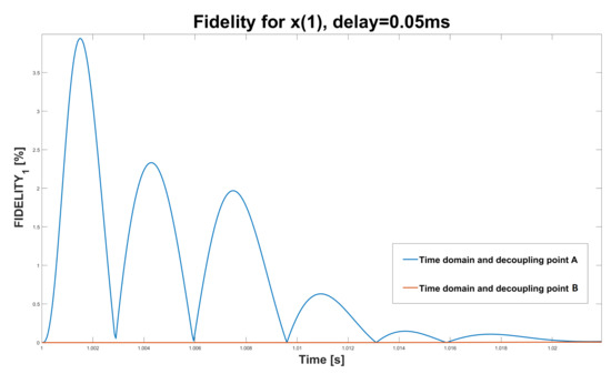 Since the critical interaction mode is the one changing its value with decoupling in decoupling point A, the fidelity of the partitioned system simulation in decoupling point B is better even for as can be seen in Figure 8. From Figure 8, it can be concluded that, for all simulation points, decoupling point B shows better simulation fidelity compared to decoupling point A, and the monolithic system response is preserved. In the case that we have highly underdamped or an extremely fast critical system mode acting as the coupling mode, this can lead to instability of the simulation even after relatively small delays of and , and this is observed on example system two from Figure 3.