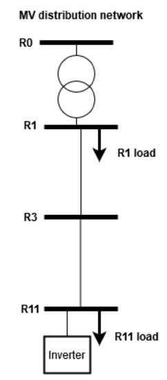 The lines of the benchmark are shorter than 15 km; therefore, natural decoupling into subsystems is not possible for the simulation time step of s. Part of the grid until node R11 is taken for this use-case, and the inverter is placed in node R11 representing a renewable energy source or battery system. The grid is modelled as a single phase balanced network with L-R lines using parameters from the report [32].