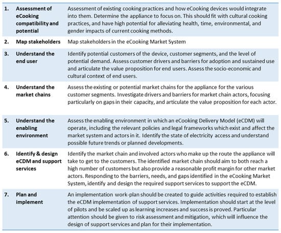 Figure 2 describes the seven-step approach to identify and design the eCDM and support services for target end-user segments. The first step is an in-depth study of eCooking compatibility and potential in the target context, and further steps are only pursued if eCooking potential is identified. An example of a suitable approach can be found in [6]. Having mapped the stakeholders, a deep dive investigation is conducted into each of the eCooking Market System building blocks (steps 3–5).