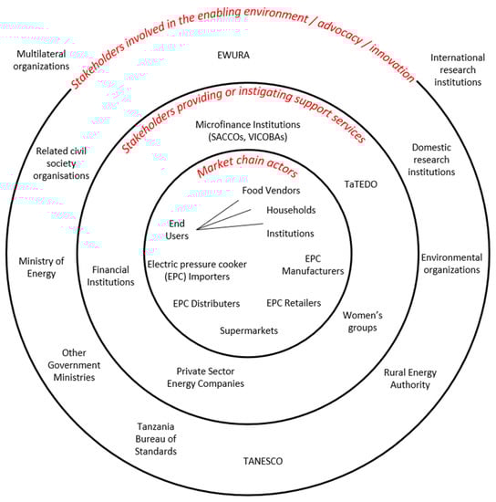 The stakeholder mapping approach in [43] was used to identify and map stakeholders according to their participation and influence on the eCDM and eCooking Market System, adapted to show reducing participation/influence via expanding concentric circles. Figure 3 shows the resulting stakeholder map. It was broadly possible to label each ring: actors who are part of the core market chain for the eCooking appliance are in the center; those who provide or are instigating support services required to realize eCDMs are one ring out; and the final two rings contain actors who set the enabling environment (such as government institutions and regulatory bodies), who are involved in advocacy to effect the enabling environment, or who are involved in research and innovation. The two outer rings differentiate between those situated in Tanzania and those who are external to the country. This mapping exercise ensured that all stakeholders, and their barriers and drivers to participation or supporting eCDMs, were assessed and considered in the research activities and eCDM development that followed. Readers may be interested in a more detailed stakeholder mapping analysis from the perspective of socio-technical innovations systems in [44].