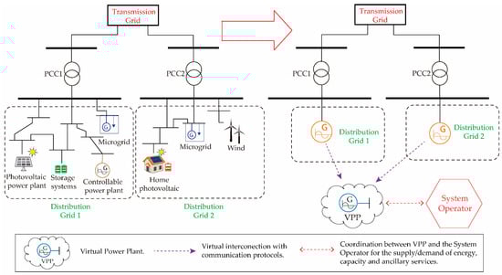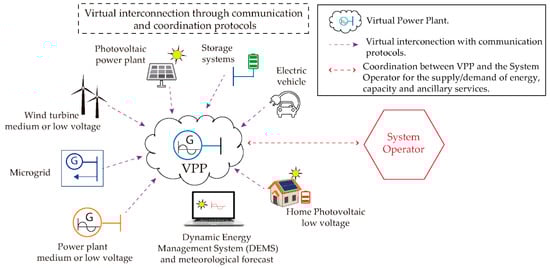 The coordinated and aggregated management of DERs in the distribution network would facilitate the integration of these units. For this purpose, an alternative has been proposed, known in the scientific literature as virtual power plants. The concept is schematized in Figure 1.