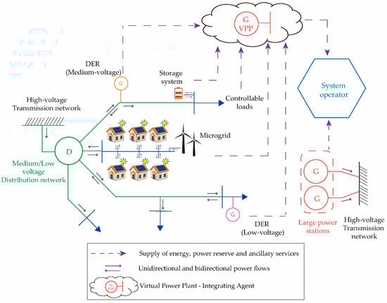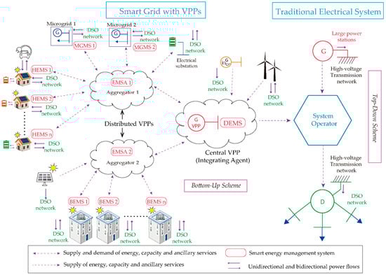 - The general structure of a smart grid with virtual power plants is proposed, based on an operational bottom-up scheme, through smart energy management systems. In this proposal, the virtual power plant acquires the specific role of “integrating agent” and participates, in a fundamental way, in the management of DERs.