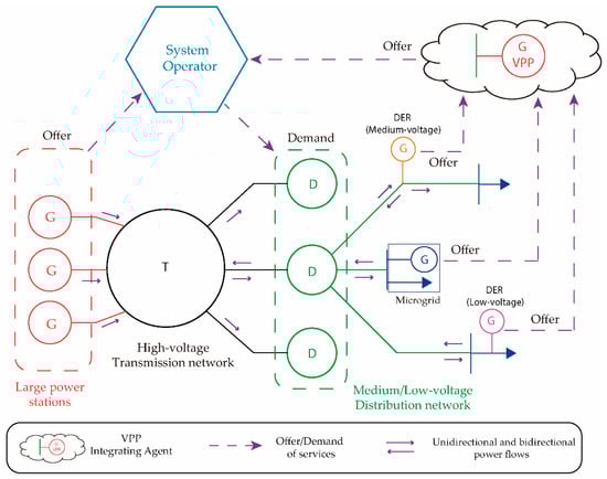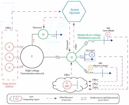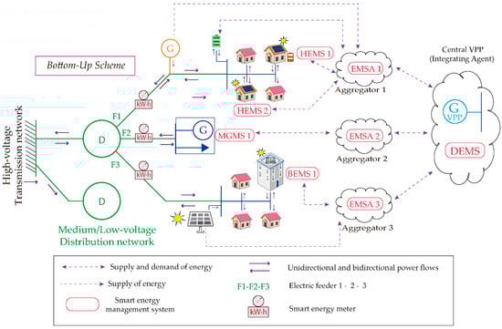 Figure 5 shows a set of DERs interconnected in the distribution grid. These elements are managed by several smart energy management systems and integrated into the EPS by distributed VPPs and by a central VPP (integrating agent). The proposed operational architecture not only controls power flows in a bottom-up manner—in this proposal, the management of each distributed element and even the electricity markets can be managed in a bottom-up scheme. For example, bottom-up management meets the technical needs of each subsystem of the distribution network through the supply of active and reactive power. Similarly, a bottom-up market could manage service offers directly between the aggregator and the DSO, without the need to participate in a centralized market.