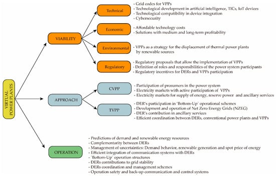 Without proper management, DERs provide power to the system exclusively when the resource is available. However, through the VPP concept and the bottom-up operational approach to the management and operation of DERs, the technical and economic integration of DERs are facilitated. The VPP not only manages the energy of the DERs—it also participates dynamically in the operation of the power system, and it can use its flexibility to offer capacity and ancillary services to the system operator. This dynamic operation of VPPs is currently under development and is known as a dynamic virtual power plant (DVPP) [49,112]. In summary, the bottom-up operating scheme promotes decentralization and facilitates the participation of DERs, providing flexibility and reducing the absolute dependence on large power plants, but in a more complex system.