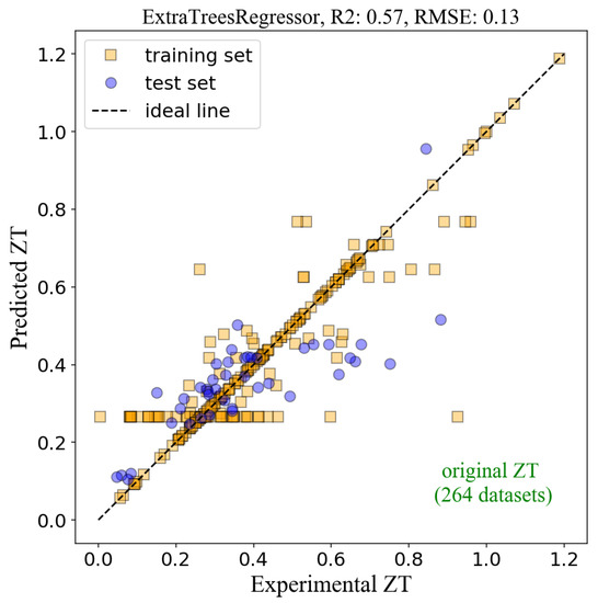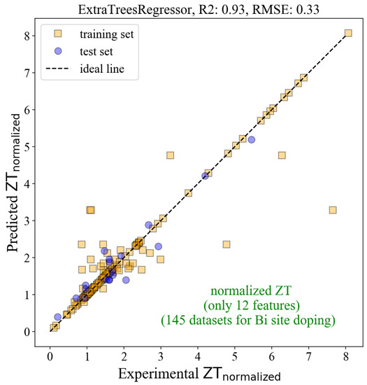 Figure 2 shows the R2 of 0.57 and the RMSE of 0.13 from the test set. The R2 value is relatively low, implying that the model is not very accurate. The model inaccuracy lies in the original data from the experiment database. The reported ZT values of the pristine BiCuSeO from several research groups varied significantly. For example, Farooq et al. reported the ZT of 0.25 [29], but Yang et al. reported the ZT of 0.42 [30] for the same compound (BiCuSeO). These points are explicitly shown in Figure 2, where the orange squares line up horizontally at the ‘predicted ZT’ around 0.3. The discrepancy was due to the experimental details, such as processing parameters, microstructures, etc., which strongly affect the ML performance because the ML models were trained with the features that were extracted from chemical formulas only. The variations from experimental parameters were not included in the ML model, resulting in the model’s inaccuracy.