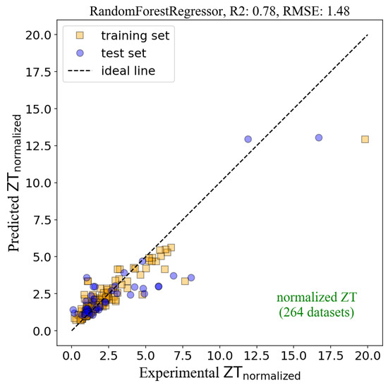 The plot of the Predicted ZTnormalized versus the Experimental ZTnormalized from the ML model using RF regressor. The total datasets of 264 datasets were used, resulting in the R2 of 0.78 and the RMSE of 1.48.