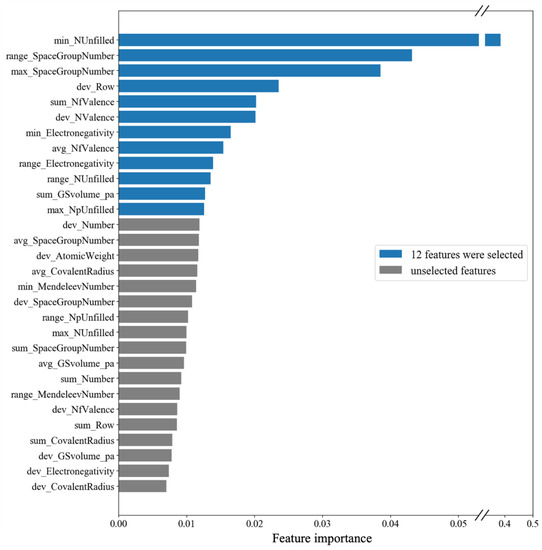 Figure 4 shows the results from the ML model based on 144 datasets for the Bi-doped BiCuSeO. The R2 was considerably increased to 0.89, with the RMSE of 0.40, indicating the improvement of the model’s accuracy. However, decreasing the amount of data and using many features (154 features) could lead to overfitting, which means the model shows high performance on the training dataset but low performance on the test set [33]. To address the issue, we exported the features or descriptors representing the material characteristics from our ML model and ranked them according to their importance to the model. There were a total of 154 generated features, but the first 30 important features are shown in Figure 5. We then optimized the ML model by including only the important features. We have tried including the first 3, the first 6, the first 9… and so on important features in the model. The best-performance model was obtained when the first 12 important features (as highlighted in Figure 5) were used. Figure 6 shows the results from such a model, with the R2 of 0.93 and the RMSE of 0.33 for the test set, an improvement in accuracy from the model in Figure 4. If one compared the model in Figure 6 to the primitive model in Figure 2, the accuracy performance increased >63%. However, before bringing the model to use, the generalization of the model was carried out via Leave One Out Cross Validation (LOOCV). This method is appropriate, particularly for small-size datasets [5]. The validation resulted in the RMSE of 0.71 for the training dataset, which means that the predicted ZTnormalized values from the model have an error of ±0.71.