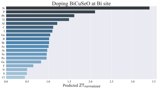 Predicted ZTnormalized values for the selected Bi0.98A0.02CuSeO compounds, where A is the dopant shown in the y-axis.