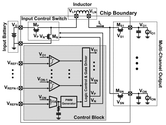 One simple way to solve this problem is to store enough energy inside an inductor with a guard band to prepare for a sudden load change in the output channel. However, since the stored energy is expected to remain in general situations, a freewheeling switch has been added to provide an additional path from the inductor output to the battery source for efficient energy management [6,10,14,19]. This freewheeling switch returns the energy remaining at the end of a single regulation cycle to the source battery. In this way, the system can prepare for sudden load change conditions and also prevent waste of energy remaining. One disadvantage of this approach is that a freewheeling switch must be turned on every switching cycle, and considering the ON resistance of the switch transistor, the total power efficiency will be degraded even if the remaining current is sent back to the battery.