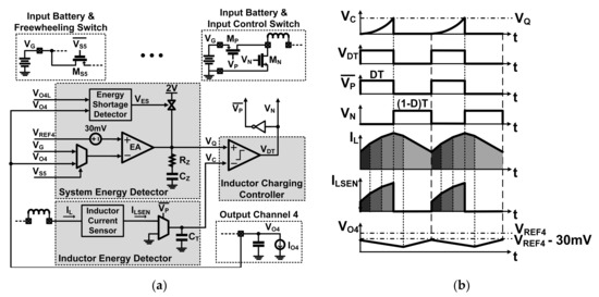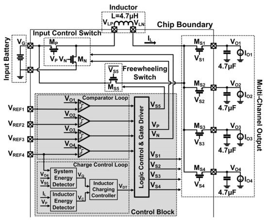 After completing the precedent charging operations of to , , which is a fourth output channel voltage, is regulated by a charge control loop to prevent the impact of cross-regulation. A charge control loop consists of a System Energy Detector, Inductor Energy Detector, and Inductor Charging Controller, and aims to extract an appropriate amount of energy from the input battery using the output voltage of the last channel as a control parameter. The control signals generated by the ‘Logic Control & Gate Driver’ except to are (1) , (2) , , and (3) , each of which controls the power switches of (1) the last channel (), (2) the input battery ( and ), and (3) freewheeling operation (), respectively.
