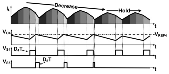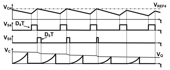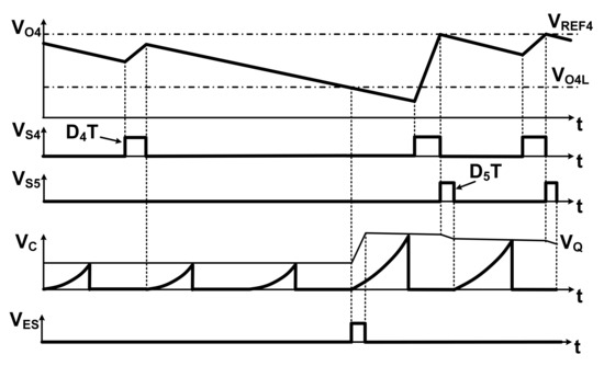 The detailed operation of the CCL can be understood by considering the load change conditions of a specific output channel. The timing diagram of the change from the high load condition to the low load condition (high-to-low load transient) is shown in Figure 6. If the load condition of the first output channel, for example, decreases ( decreases), the system is switched to an energy redundancy state, and accordingly, the output voltage of the fourth output channel increases to the reference level . Then the switch transistor of this output is turned off through the signal from the comparator loop and the freewheeling switch is turned on (through ) until the end of the conversion cycle.