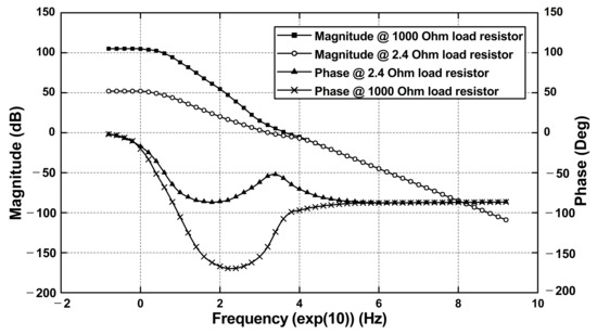 Based on Equation (1), the compensation resistor and capacitor values, and , for system stability can be determined. Since and determine the positions of the pole and zero of the transfer function, these values are used to stabilize the system under all load conditions. The proposed converter is designed with the following parameters , and . Figure 8 shows the frequency responses under two extreme load conditions (2.4 and 1000 Ohm) of the feedback loop to which the parameters presented here are applied. Note that the proposed converter system shows stable operation under all possible conditions with different loads and different frequencies. Here, the switching frequency of 1 MHz, where switching loss is not dominant over the total loss, is selected and responds quickly to changes in load current.