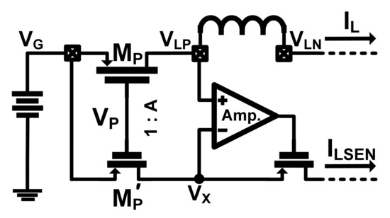 As shown in Figure 9, the proposed system uses a conventional inductor current sensor consisting of a current mirror and an amplifier. The inductor current flowing through the upper switch transistor is copied through the lower switch transistor , and the magnitude is reduced by the coefficient. Here, factor is selected as 6000 for our design to ensure proper charging time and loop stability. The amplifier in the final stage keeps the voltage level of the and nodes approximately the same to accurately copy the inductor current.