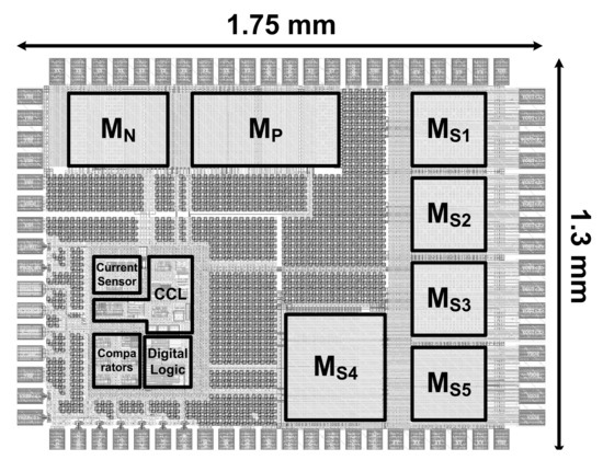 The total area including the pad is (1.75 mm × 1.3 mm), of which the core area is . As can be seen from the area breakdown shown in Table 1, most areas are occupied by power switches and a freewheeling switch, while the main idea of our proposal, the hybrid comparator-charge control loop including the four items at the bottom of the table, consumes only of area corresponding to 18.2% of the core area.
