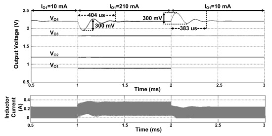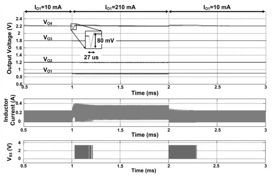 The performance of the proposed converter system was checked under exactly the same load conditions after checking the performance of the conventional OPDC control method through load conditions changes, and the resulting waveform is shown in Figure 12. As illustrated in Figure 12, the node had the same load current change from 10 mA to 210 mA, but simulation results show that only a slight voltage crop (~80 mV) occurred in the last output channel, and the voltage level of was stabilized with 27 µs.