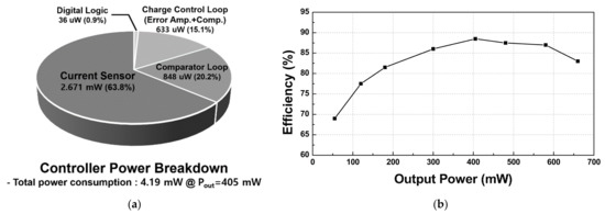 The power consumption breakdown of the proposed SIMO DC-DC converter with a hybrid controller with 405 mW output power is shown in Figure 13a. The total estimated power consumption of the proposed controller is 4.19 mW, and most of the power is consumed by the current sensor (63.8%) and comparators (20.2%). The remaining small portion of the power budget is used for the proposed hybrid control, which is about 16% of the controller power.
