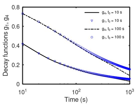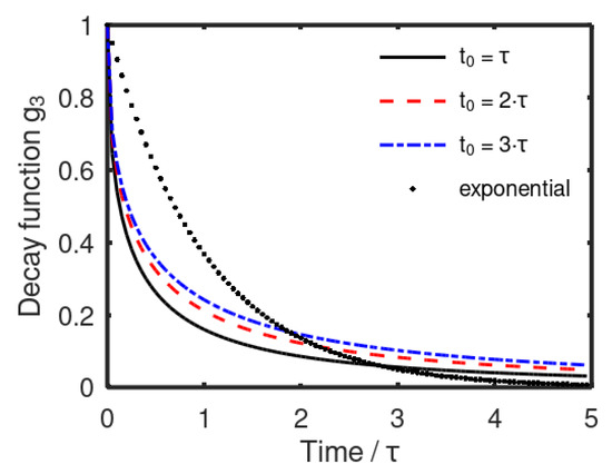 Again, and , so that is another form of the decay function obtained for a different initialization current profile. The decay functions and are shown in Figure 1 for and two different values of . The decay rates are slow for long times and are different in the four cases, thus proving the influence of the previous history.