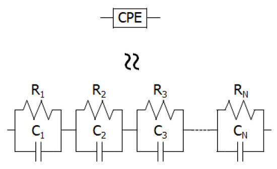 To avoid the problems associated with the fractional derivatives, the fractional impedances are often approximated by functions with a finite number of poles and zeros. One possibility is that proposed by [33], and used by other authors [8], in which the fractional-order transfer function is approximated with a high-degree integer-order system. Another option is to approximate the CPE (or the ZARC) by a network composed by a series of RC branches [6,34], as shown in Figure 4. The approximation of the ZARC using finite and infinitely serially connected RC circuits was analyzed in detail in [35]. We consider the approximation of a CPE by a series RC network in this section.