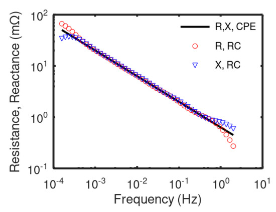 The behavior of the decay function can be compared with the decay function of the CPE that the RC network approximates. To do so, we considered a Warburg-type CPE, with , and approximated it by an RC network with five elements (). We used typical parameter values of a Warburg impedance for a Li-ion battery [8,34]: (1) The values of and were obtained by a least-square fit to the real and imaginary parts of the CPE impedance in the range MHz to Hz. (2) The real part of the CPE impedance at 1 MHz is 20 m. The values of the RC network components are provided in Table 1.