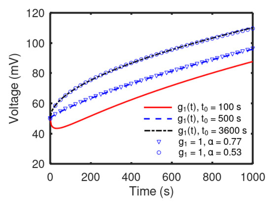 Time-domain models for predicting the voltage–current characteristics of lithiumion batteries under arbitrary charging and discharging current profiles have been reported, showing a higher accuracy than the traditional models with multiple parallel RC units [29,30]. The initial voltage has been considered in an equation similar to (14). With this way of initialization, acts as an integration constant and is always remembered, as we would expect in the case of an ideal non-fractional capacitor, that it is not what we should obtain in the limit . Instead, we would expect to obtain: