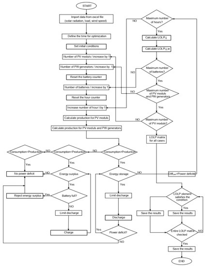 For a particular combination of all system components: PV panels i, batteries j and wind turbines w, LOLP(i,j,w) is determined with the following Equation (26):