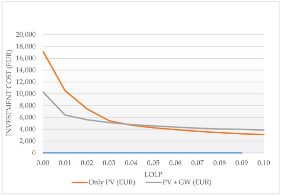 From Figure 5, as can be seen when the LOLP is low, investment cost of the system is higher, which is to be expected. For the location of the City of Osijek, where wind is not a significant factor, it is surprising that, in the range from 0 to 0.01 LOLP value, the investment costs of the system consisting of wind turbines are lower than the system consisting of only PV. Moreover, it can be concluded that a significant increase in investment costs for LOLP equals 0 when a system without a wind turbine is chosen, compared to a system with a wind turbine.