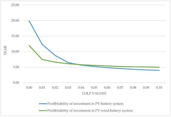 Profitability of investment regarding both scenarios—investment in PV-battery system and investment in PV-wind-battery system—is shown in Figure 6.