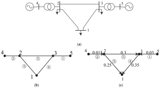 An actual network structure of the IEEE 5-Bus system is shown in Figure 1a. The graph G and network D are obtained by using the above method, which is shown in Figure 1b,c. From Figure 1b, the degree of nodes is [2, 3, 3, 1, 1]T, the edge betweenness is [3, 3, 1.5, 1.5, 1] T, and the nodes ②③ and lines ①② are more important than other nodes and lines. From Figure 1c, the out-degree of nodes is [0, 2, 1, 1, 1]T, the edge betweenness is [2, 3, 0.5, 1.5, 1.5]T, and node ② and line ② are more important.