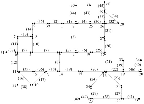 In this part, IEEE 39-Bus system is used as the simulation analysis system, which has 39 nodes, including 10 generator nodes and 19 load nodes. According to the capacity of the generator and power load, the 39 nodes can be divided into 9 generator nodes, 20 load nodes, and 10 contact nodes. The corresponding directed-weighted network model is shown in Figure 3.