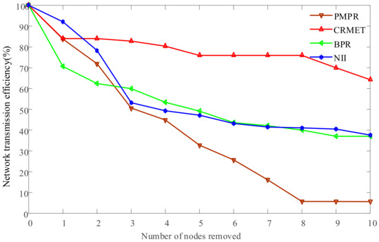 For verifying the validity of the modified PageRank algorithm for key node identification, an intentional attack is used for simulation in the normal operation test system. The identified first 10 key nodes are removed in turn by PMPR, BPR, CRMET, and the NII method. The network transmission efficiency values are shown in Figure 4.